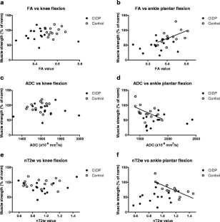 Magnetic resonance imaging (MRI) with diffusion tensor imaging (DTI) has shown that fractional anisotropy (FA) is lower in peripheral nerves in chronic inflammatory demyelinating polyneuropathy (CIDP). We examined whether DTI correlates to muscle strength or impairment.