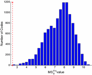 In order to perform the error-robustness calculations, we followed the procedure by Haig and Hurst (1991) and considered the squared distances. In this way, the zeroes in the diagonal remain zero. The values for small changes become slightly larger (so the edge from Phe to Tyr gets a value 9), while the values for large changes (like going from Gly to Tyr) become considerably larger (in the case of Gly to Tyr 20 becomes 400). Large changes thus get stronger emphasis (Di Giulio 1989). Whether squaring is the right way to make these kind of calculations has been discussed elsewhere (Ardell 1998; Freeland et al. 2000); we just want to compare molecular structure as an input to characteristics like polar requirement, hydropathy, volume and isoelectric point, as studied by Haig and Hurst (1991). The histograms of the error-robustness in terms of molecular structure are shown in the right column of Fig. 2.