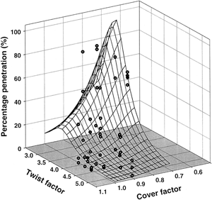 Statistical models estimating the level of protection and thermal comfort performance of woven fabrics were developed using simple fabric and liquid parameters. Eighteen woven fabrics were evaluated against three pesticide mixtures of atrazine and pendimethalin at different concentrations. Using three mixtures that represent a range of both surface tension and viscosity, percentages of pesticide penetration are measured, along with fabric thickness, fabric cover factor, yarn twist factor, yarn packing factor, solid volume fraction, wicking height, and air permeability. Statistical analyses are performed to examine the relationship between liquid/fabric parameters and pesticide penetration. Statistical analyses show that fabric cover factor, yarn twist factor, viscosity of pesticide mixture, critical surface tension of solid, and wicking height are significant parameters affecting pesticide penetration. For this purpose, cover factor and twist factor are better parameters in describing the geometry of woven fabrics than solid volume fraction. Modeling of comfort performance of woven fabric based on simple textile parameters shows that the combination of fabric thickness, cover factor, yarn twist factor and yarn packing factor can be used to estimate air permeability of woven fabric. These findings could be used for developing selection charts or tools as guidelines for the selection of personal protective equipment for use in hot, humid environments.