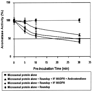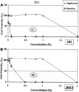 Roundup® is the major herbicide used worldwide, in particular on genetically modified plants that have been designed to tolerate it. We have tested the toxicity and endocrine disruption potential of Roundup (Bioforce®) on human embryonic 293 and placental-derived JEG3 cells, but also on normal human placenta and equine testis. The cell lines have proven to be suitable to estimate hormonal activity and toxicity of pollutants. The median lethal dose (LD50) of Roundup with embryonic cells is 0.3% within 1 h in serum-free medium, and it decreases to reach 0.06% (containing among other compounds 1.27 mM glyphosate) after 72 h in the presence of serum. In these conditions, the embryonic cells appear to be 2–4 times more sensitive than the placental ones. In all instances, Roundup (generally used in agriculture at 1–2%, i.e., with 21–42 mM glyphosate) is more efficient than its active ingredient, glyphosate, suggesting a synergistic effect provoked by the adjuvants present in Roundup. We demonstrated that serum-free cultures, even on a short-term basis (1 h), reveal the xenobiotic impacts that are visible 1–2 days later in serum. We also document at lower non-overtly toxic doses, from 0.01% (with 210 μM glyphosate) in 24 h, that Roundup is an aromatase disruptor. The direct inhibition is temperature-dependent and is confirmed in different tissues and species (cell lines from placenta or embryonic kidney, equine testicular, or human fresh placental extracts). Furthermore, glyphosate acts directly as a partial inactivator on microsomal aromatase, independently of its acidity, and in a dose-dependent manner. The cytotoxic, and potentially endocrine-disrupting effects of Roundup are thus amplified with time. Taken together, these data suggest that Roundup exposure may affect human reproduction and fetal development in case of contamination. Chemical mixtures in formulations appear to be underestimated regarding their toxic or hormonal impact.