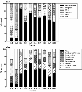 Microplastic contamination of the marine environment is a worldwide concern. The abundance of microplastics was evaluated in the sea surface microlayer in Jinhae Bay, on the southern coast of Korea. The microplastics in this study are divided into paint resin particles and plastics by polymer type. The mean abundance of paint resin particles (94 ± 68 particles/L) was comparable to that of plastics (88 ± 68 particles/L). Fragmented microplastics, including paint resin particles, accounted for 75 % of total particles, followed by spherules (14 %), fibers (5.8 %), expanded polystyrene (4.6 %), and sheets (1.6 %). Alkyd (35 %) and poly(acrylate/styrene) (16 %) derived from ship paint resin were dominant, and the other microplastic samples consisted of polypropylene, polyethylene, phenoxy resin, polystyrene, polyester, synthetic rubber, and other polymers. The abundance of plastics was significantly (p < 0.05) higher in Jinhae Bay, which is surrounded by a coastal city, than along the east coast of Geoje, which is relatively open sea. The floating microplastic abundance in surface water was the highest reported worldwide.
