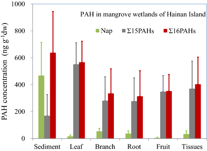 Mangrove wetlands are important coastal ecosystems in tropical and subtropical regions, and mangrove sediments and tissues often are the pollutant sinks due to their high organic matter contents. Polycyclic aromatic hydrocarbons (PAHs) in the mangrove sediments and tissues of nine species from three typical mangrove wetlands of Hainan Island were studied. The average concentration of PAHs in all mangrove tissues was 403 ng g−1 dw, with PAHs concentrations in leaf, branch, root, and fruit of 566, 335, 314, and 353 ng g−1 dw, respectively. PAHs levels were much higher in leaf than in other mangrove tissues, which may be caused partly by atmospheric deposition of PAHs. The dominant individual PAH compounds in mangrove tissues were phenanthrene (41.3%), fluoranthene (14.7%), and pyrene (11.4%), while in sediments were naphthalene (73.4%), phenanthrene (3.9%), and pyrene (3.6%), respectively. The biota-sediment accumulation factors of PAH congeners in the mangrove wetlands showed different patterns, with the most predominant of phenanthrene. The cycling of PAHs in the mangrove wetlands of Hainan Island also were estimated, and the results showed that the standing accumulation, the annual absorption, the annual net retention, the annual return, and the turnover period in all mangrove tissues of the community were 2228 µg m−2, 869 µg m−2 a−1, 206 µg m−2 a−1, 663 µg m−2 a−1, and 3.4 a, respectively. These results indicated that mangroves are playing an important role in retaining PAHs.