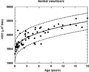 The ADC was found to increase with age with the largest increase being in the first year of life, the rate of change being described by a constant plus a power function, specifically 1349+{358.5*{age^0.34}}, (P<0.001).