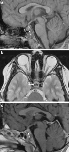We retrospectively reviewed 232 consecutive 1.5- and 3-T brain MRIs in children ages 0–18 years (mean: 8.3±5.3 years). We evaluated 3-D volumetric T1 spoiled gradient echo (SPGR) and axial T2-weighted sequences. Pituitary glands were evaluated for the presence, size and signal characteristics of cysts. Cyst volumes were measured in three orthogonal planes. Endocrine abnormalities were documented from the medical record.