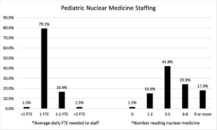 Sixty-seven people from at least 29 hospitals responded to the survey, including all 10 of the 2018–2019 U.S. News & World Report best children’s hospitals. The majority (48/67, 71.6%) of respondents indicated that pediatric nuclear medicine examinations were interpreted in the pediatric radiology department by pediatric radiologists and that most physicians interpreting the exams (43/67, 64.2%) did not have subspecialty certification in nuclear medicine or nuclear radiology. Most facilities offered PET/CT (57/67, 85.1%); few offered PET/MRI (12/67, 17.9%). Most facilities offered radiotherapies (57/67, 85.1%) but at most of these facilities (30/57, 52.6%), fewer than half the physicians who cover nuclear medicine were approved to administer therapies. In the subset analyses based on proportion of physicians with additional nuclear medicine board certification, there were statistically significant differences between the groups in availability of PET/MRI, lutetium-177 dotatate therapy programs, and percentages of physicians approved to administer therapies.