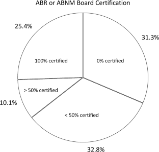 The SPR emailed our 25-question survey to all 1,847 SPR members in August 2018 and we accepted responses until April 2019. Questions focused on nuclear medicine staffing, positron emission tomography (PET) utilization, and radiotherapy availability. Respondents could indicate their affiliated hospital, which we used for data cataloguing only. Analysis of survey responses was blinded to reported institution. We analyzed response data using contingency tables. Independence testing between categorical variables based on proportions of physicians with additional nuclear medicine board certification was performed on a subset of questions regarding PET and therapy practices.