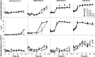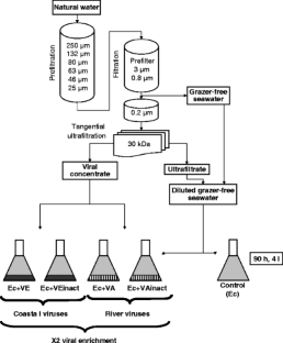 Nutrients and virus-to-bacteria ratio variations in batch cultures during 90 h in February, March, June and July 2004. Ec, Control flask; V E or V A, viral concentrate from station E or A; V Einact or V Ainact, inactivated concentrate. (PDF 410 KB)