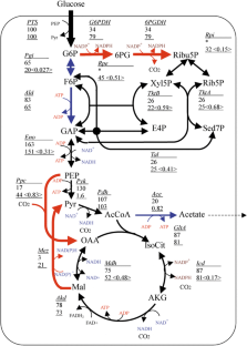 Sauer U, Lasko DR, Flaux JL, Hochuli M, Glaser R, Szyperski T, Wüthrich K, Bailey JE (1999) Metabolic flux ratio analysis of genetic and environmental modulations of Escherichia coli central carbon metabolism. J Bacteriol 181:6679–6688