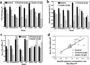 Palmqvist E, Grade H, Meinander NQ, Hahn-Hägerdal B (1999) Main and interaction effects of acetic acid, furfural, and p-hydroxybenzoic acid on growth and ethanol productivity of yeast. Biotechnol Bioeng 63:46–55