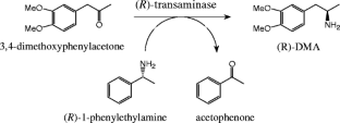 Arthrobacter sp. KNK168 shows (R)-enantioselective transaminase [(R)-transaminase] activity, which converts prochiral ketones into the corresponding chiral (R)-amines in the presence of an amino donor. The cultural conditions and reaction conditions for asymmetric synthesis of chiral amines with this microorganism were examined. The transaminase was inducible, and its production was enhanced by the addition of sec-butylamine and 3-amino-2,2-dimethylbutane to the culture medium. (R)-1-Phenylethylamine was a good amino donor for amination of 3,4-dimethoxyphenylacetone with Arthrobacter sp. KNK168. Under the optimum conditions, 126 mM (R)-3,4-dimethoxyamphetamine (DMA) [>99% enantiomeric excess (ee)] was synthesized from 154 mM 3,4-dimethoxyphenylacetone and 154 mM (R)-1-phenylethylamine through the whole cell reaction with an 82% conversion yield. (R)-Enantiomers of other amines, such as (R)-4-methoxyamphetamine, (R)-1-(3-hydroxyphenyl)ethylamine and (R)-1-(3-hydroxyphenyl)ethylamine, were also synthesized from the corresponding carbonyl compounds through asymmetric amination with Arthrobacter sp. KNK168.