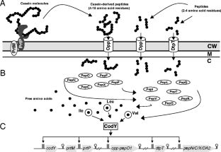Kunji E, Hagting A, De Vries C, Juillard V, Haandrikman A, Poolman B, Konings WN (1995) Transport of β-casein-derived peptides by the oligopeptide transport system is a crucial step in the proteolytic pathway of Lactococcus lactis. J Biol Chem 270:1569–1574