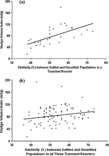 Problems with deflocculation and solids separation in biological wastewater treatment systems are linked to fluctuations in physicochemical conditions. This study examined the composition of activated sludge bacterial communities in lab-scale sequencing batch reactors treating bleached kraft mill effluent, under transient temperature conditions (30 to 45 °C) and their correlation to sludge settleability problems. The bacterial community composition of settled and planktonic biomass samples in the reactors was monitored via denaturing gradient gel electrophoresis of 16S ribosomal RNA gene fragments. Our analysis showed that settled biomass has a different community composition from the planktonic biomass (49 ± 7% difference based on Jaccard similarity coefficients; p < 0.01). During times of poor sludge compression, the settled and planktonic biomass became more similar. This observation supports the hypothesis that settling problems observed were due to deflocculation of normally settling flocs rather than the outgrowth of non-settling bacterial species.