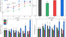 The growth profiles of D. salina under different light intensities could be divided into two groups, light-dependent growth (approximately linear) and light-inhibited growth (Fig. 3a and Fig. S2 in the ESM). Specifically, growth of D. salina was either light-dependent with a photon flux of 128 μE/m2/s or lower (85 and 42 μE/m2/s), or light-inhibited when the incident photon flux was 170 or 255 μE/m2/s. Further, the maximum average growth rate was 0.32 gDCW/L/day at a photon flux of 128 μE/m2/s, and the average biomass yield was similar under all light-dependent conditions. As the growth rate increased in a linear fashion over the range of 42 to 128 μE/m2/s, it appears that the latter photon flux is suitable for efficient growth of D. salina.