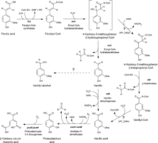 Narbad A, Gasson MJ (1998) Metabolism of ferulic acid via vanillin using a novel CoA-dependent pathway in a newly-isolated strain of Pseudomonas fluorescens. Microbiology 144:1397–1405