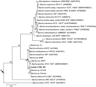 Domingos DF, Dellagnezze BM, Greenfield P, Reyes LR, Melo IS, Midgley DJ, Oliveira VM (2013) Draft genome sequence of Bacillus pumilus CCMA-560, isolated from an oil-contaminated mangrove swamp. Genome Announc 1:e00707–e00713. doi:10.1128/genomeA. 00707-13