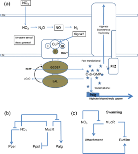 Alginates exhibit unique material properties suitable for medical and industrial applications. However, if produced by Pseudomonas aeruginosa, it is an important virulence factor in infection of cystic fibrosis patients. The alginate biosynthesis machinery is activated by c-di-GMP imparted by the inner membrane protein, MucR. Here, it was shown that MucR impairs alginate production in response to nitrate in P. aeruginosa. Subsequent site-specific mutagenesis of MucR revealed that the second MHYT sensor motif (MHYT II, amino acids 121–124) of MucR sensor domain was involved in nitrate sensing. We also showed that both c-di-GMP synthesizing and degrading active sites of MucR were important for alginate production. Although nitrate and deletion of MucR impaired alginate promoter activity and global c-di-GMP levels, alginate yields were not directly correlated with alginate promoter activity or c-di-GMP levels, suggesting that nitrate and MucR modulate alginate production at a post-translational level through a localized pool of c-di-GMP. Nitrate increased pel promoter activity in the mucR mutant while in the same mutant the psl promoter activity was independent of nitrate. Nitrate and deletion of mucR did not impact on swarming motility but impaired attachment to solid surfaces. Nitrate and deletion of mucR promoted the formation of biofilms with increased thickness, cell density, and survival. Overall, this study provided insight into the functional role of MucR with respect to nitrate-mediated regulation of alginate biosynthesis.
