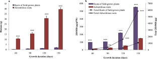 • Biomass accumulation was higher in adventitious root cultures than in field-grown plants.