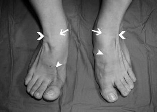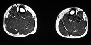 A 35-year-old woman presented with bilateral leg pain on walking that had been present since childhood. Clinical examination showed bilateral absence of the tibialis anterior tendons and the left extensor hallucis longus tendon. Magnetic resonance imaging revealed that signal intensities in the location of the tibialis anterior muscles bilaterally and the left extensor hallucis longus muscle were uniformly high on T1-weighted images, consistent with fat tissue and aplastic muscles: findings not previously reported.