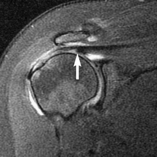 This study was reviewed and approved by our Institutional Review Board. The reports of 548 consecutive MR examinations of the shoulder were reviewed, looking for mention or description of delamination tears of the rotator cuff. The images of the identified cases were then reviewed by two radiologists to confirm the findings. Correlation with surgical and arthroscopic information was then performed. Delamination tears were defined as horizontal retraction of either the bursal or articular surface of the tendon, manifest as thickening of the torn retracted edge, and/or interstitial splitting of the tendon, manifest as fluid-like high signal intensity on fat-suppressed T2-weighted oblique coronal images.
