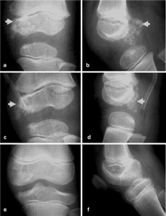 The objectives of this communication were to discuss radiographic and magnetic resonance (MR) imaging manifestations and clinical outcome after complete and incomplete resection of the mass of dysplasia epiphysealis hemimelica (DEH).