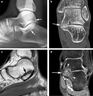 The study included 50 patients, 28 males and 22 females with a mean age of 21.1 years (range 8–70 years). In 15 patients, both ankles had been imaged, resulting in a total of 65 cases. In 17 ankles, no TCC was identified, while 15 ankles were classified as EA-PM TCC and 33 as having other types of TCC. There were no statistically significant differentiating radiological features between the groups with no TCC and EA-PM TCC apart from prominence of the posterior subtalar joint, while only the C-sign allowed identification of patients with other types of TCC.