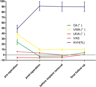 CA, VWA and AVH were significantly corrected after surgery. CA changed from 23.7 to 3.0 (p <0.001), VWA from 38.7 to 9.6 (p <0.001) and AVH from 48.8 % to 91.2 % (p <0.001). These parameters were well maintained during the follow-up period with a mild, tolerant loss of correction. Neurological function and pain were significantly improved without deterioration. Age, pre-A/P and pre-AVH < 50 % influenced kyphosis recurrence (p = 0.032, 0.026, 0.011, respectively).
