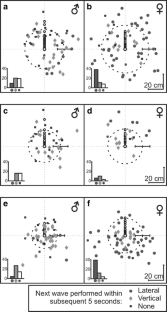 To respond appropriately to communication signals, animals must have the ability to decipher signal meaning. At a basic level, interpreting the difference between territorial and courtship signals can be vital for the survival and reproduction of social animals. Male and female fiddler crabs communicate with claw-waving displays, but the function of these waves remains uncertain. Species differ in the context in which they wave: Some wave during courtship, some during territorial defence and some during both. In this paper, we provide evidence that males of an Australian species of fiddler crab, Uca perplexa, use two different types of claw waving display, lateral and vertical. Lateral waves are employed solely in a courtship context, whilst vertical waves are employed during courtship as well as territorial interactions. Using video recordings, we show that lateral waves were produced spontaneously (broadcast), and their frequency increased only in the presence of female wanderers. Vertical waves were not broadcast but were elicited by male wanderers during agonistic interactions and female wanderers during close range courtship. Male resident U. perplexa were able to discriminate the sex of wandering crabs on the mudflat at distances of 32 cm. During all resident–wanderer interactions, residents attempted to maintain a position directly between the wanderer and the home burrow and orient themselves to face females and to present the major claw towards males. To our knowledge, this is the first demonstration of the multiple use of waving displays in a fiddler crab species.