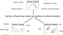 The ability to discriminate self from non-self is fundamental to the evolution and function of biological systems ranging from multicellular organisms to colonies of social insects (Grosberg 1988; Hölldobler and Wilson 1990; Bourke and Franks 1995; Crozier and Pamilo 1996; Tsutsui 2004). In the social insects, it is believed that a worker discriminates nestmates from non-nestmates by comparing the olfactory cues on the surface of individuals they encounter with a cognitive representation of the suite of acceptable odors, known as a template (Getz 1982; Lacy and Sherman 1983; Stuart 1988; Breed et al. 1988; Reeve 1989; Tsutsui 2004). In many cases, young workers form their template by imprinting on the odors of nestmates (Lacy and Sherman 1983). The odor profile is a composite of various chemicals, which may be of genetic or environmental origin, with cuticular hydrocarbons, which have a genetic basis, playing a prominent role (Vander Meer and Morel 1998; Soroker et al. 1998; Lah av et al. 1999; Howard and Blomquist 2005; Foitzik et al. 2007; Martin et al. 2008, 2009, D’Ettorre and Lenoir 2010; Guerrieri et al. 2009; D’Ettore and Lenoir 2009).
