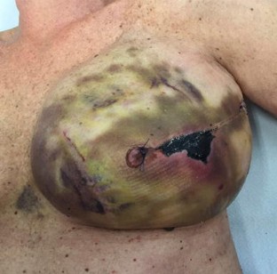 One-stage implant-based breast reconstruction has been recently improved by the introduction of biological [acellular dermal matrix (ADM)] and synthetic meshes. Advantages of ADMs in implant-based breast reconstruction derive from the expansion of the space available for the direct positioning of an implant, but their use could be associated with several complications. Although the majority of complications can be easily managed, mistakes in dealing with the first clinical signs of a potential adverse event can lead to implant loss.