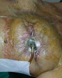 We report a case of ADM/implant exposure following NAC-sparing mastectomy and immediate implant-based reconstruction, successfully managed with an innovative staged treatment using negative pressure wound therapy, which allowed a rapid re-positioning of the prosthesis after complete clearance of bacteria from the implant pocket.