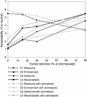 The effects of viewing different types of information were investigated in people judging the social acceptability of alternative forest harvest systems. Approximately 500 Tasmanians were shown still-simulated images of four harvest systems (a clearfell system, two aggregated retention systems, and a selective system) and were asked to judge their acceptability. Individual interviews were conducted with 12 of the participants. It was anticipated that people holding different beliefs about the consequences of harvesting would have different responses to information. Cluster analysis was used to group participants according to these beliefs. Responses to still images were compared with responses to two other types of information: information about consequences of the harvest systems in the form of indicator symbols, and information about regeneration over time, presented as visual animations. The effects of information differed across both harvest system and belief cluster groups of participants. The largest effects of information occurred in people who held a mix of beliefs about consequences. Within this group, participants who viewed the indicators rated a 30% aggregated retention system higher and selective harvesting lower, than those who did not view the indicators. Viewing animated sequences led to slightly higher ratings of the more intensive harvest systems and significantly lower ratings of the selective harvest system than those based on the still images. The interview data provided examples of interviewees viewing information critically against their own values and beliefs. Only some interviewees appeared to use it in judging social acceptability