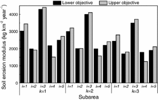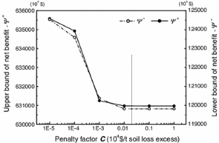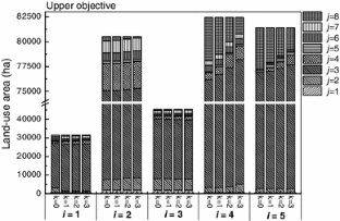 where symbol “±” denotes an interval set with “+” and “−” as the upper and lower bounds of an interval-parameter, respectively; sign “\(\underset{\raise0.3em\hbox{$\smash{\scriptscriptstyle\thicksim}$}}{ \le }\)” suggests a fuzzy relationship between the left- and right-hand sides; \({\text{XX}}_{{j^{\prime } ,i,j,k}}^{ \pm }\) is decision variables; \(X_{i,j,k}^{ \pm }\) represents the decision state of land use allocation.