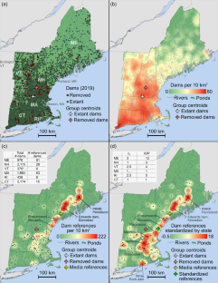 Dams are a globally important social-ecological issue, and the practice of removing aging or obsolete dams is increasing in many countries where rivers have been used to fuel industrial growth. News media play an important role in providing information and raising awareness about dam-related decision making and patterns in news media coverage can shape public sense-making about potentially controversial dam decisions. This research focuses on spatial patterns of news media references to “dam removal” georeferenced to a New England dams database, the types of dam removal characteristics that contribute to newsworthiness, and specific media framing strategies. We develop a method, known as DAMMDA, that combines a large geodatabase of dam features and corpus of news media articles. We find that spatial patterns of “dam removal” news media coverage do not necessarily coincide with the actual occurrence of removed dams, nor the distribution of extant dams, in the landscape. Instead, a minority of dams with specific characteristics make up the majority of dam media references. Such “newsworthy dams” are capable of generating hydroelectricity, are situated on large rivers, are located in urban areas, or have already been removed. Further, references to newsworthy dams are often used to frame discussions about future dam decisions in other locations in New England and across the United States. We conclude by reflecting on how this approach is relevant for understanding complex and interconnected factors that can shape controversial sustainability issues, such as the relationships between news media and social-ecological characteristics of infrastructures within landscapes.