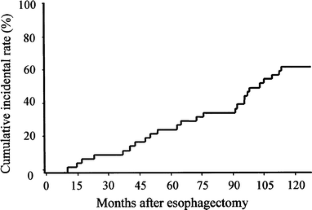 Among a total of 141 patients, 48 (34%) had RE in the cervical remnant, with 14 (29%) cases categorized as grade B, nine (19%) as grade C, and 25 (52%) as grade D. The cumulative incidence of RE in the cervical remnant was 24% at 5 years after surgery and 60% at 10 years, respectively. Pyloroplasty and bile reflux were identified as independent risk factors of RE in the cervical remnant by univariate and multivariate analyses.