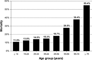 During the study period, 98,242 patients were admitted for firearm-related injuries, and 3,190 (3.2%) of them were ≥55 years old. Within the elderly age segment of the population, 1,676 patients (52.5%) were 55–64 years of age, 727 (22.8%) were 65–74 years of age, and 787 (24.7%) were ≥75 years old. The incidence of severe trauma [Injury Severity Score (ISS) ≥ 16] in the elderly age strata was 43.3, 46.8, and 57.6%, respectively (p < 0.001). Patients ≥75 years old were significantly more likely than patients 55–74 years old to suffer self-inflicted injuries. The most commonly encountered injury in elderly patients was gunshot wounds to the head, which increased in a stepwise fashion with advancing age (25.8, 31.6, and 39.4% respectively; p < 0.001). The crude mortality rate in all patients sustaining gunshot wounds increased progressively with age. Within the elderly age segment, mortality ranged from 28.5% in the age stratum 55–64 years, to 55.4% in the stratum ≥75 years (adjusted p < 0.001). Intensive care unit and hospital length of stay increased with advancing age but peaked and remained stable among the elderly age groups. An admission Glasgow Coma Score (GCS) ≤ 8, an ISS ≥ 16, hypotension on admission, age, self-inflicted injury, and injury sustained by assault were factors independently associated with death in patients ≥55 years.
