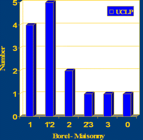 Two hundred files were reviewed: 60 cases of unilateral cleft lip, seven of bilateral cleft lip, 44 of unilateral cleft lip palate (UCLP), 29 of bilateral cleft lip palate (BCLP), 53 of cleft palate (CP), three of bilateral oro-ocular cleft, one of unilateral and two of median clefts (Binder), and one of commissural cleft. Sixty-nine (35 %) of these cases were not operated in Africa: 25 (12.5 %) had not shown up, 28 (15 %) were considered unfit for surgery (Down’s syndrome, HIV-positive, malnutrition, cardiac malformation), and 16 (7.5 %) were transferred to Switzerland. Palatal fistula occurred in 20 % of UCLP, 30 % of BCLP, and 16 % of CP. Evaluation of speech after palate surgery gave less than 50 % of socially acceptable speech.