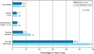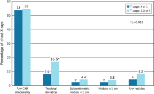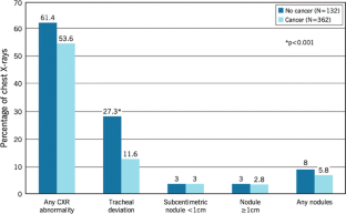 Of the total cohort, 83% had a preoperative CXR and 67% had cancer on surgical pathology. In total, 56% had at least one CXR abnormality, the most frequent being skeletal abnormalities (25%), followed by tracheal deviation (16%). Of 78 patients (15.8%) with tracheal deviation on CXR, only 5% had a difficult intubation. Tracheal deviation was more commonly seen in non-cancer cases compared to cancer cases (27 vs. 12%, p < 0.001). CXR impacted management in 4%. Among patients with cancer, a higher T-stage (>2) was associated with higher rate of tracheal deviation compared to T1 (17 vs. 8%, p < 0.001). While patients with non-metastatic cancer (n = 277) compared to metastatic cancer patients had a higher proportion of any abnormality on CXR (57 vs. 44%, p = 0.045), there was no significant difference for tracheal deviation, skeletal abnormalities or lung nodules. Of patients with nodules on CXR (n = 29), only 14% were found to have metastatic disease.