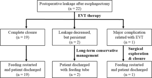 Hwang JJ, Jeong YS, Park YS et al (2016) Comparison of endoscopic vacuum therapy and endoscopic stent implantation with self-expandable metal stent in treating postsurgical gastroesophageal leakage. Medicine (Baltimore) 95:e3416