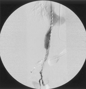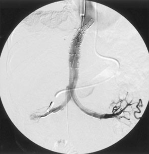A patient who had undergone his third orthotopic liver transplantation nearly 9 years prior to presentation developed worsening hepatic and renal function, as well as severe bilateral lower extremity edema. Magnetic resonance imaging demonstrated vena caval thrombosis from the suprahepatic venous anastomosis to the infrarenal inferior vena cava, obstructing the renal veins. This was treated by percutaneous placement of metallic stents from the renal veins to the right atrium. At 16 months clinical follow-up, the patient continues to do well.