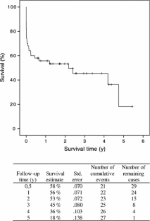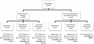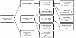 Fifty patients, aged 79 ± 9 years (mean ± SD), out of 66 consecutive patients with AMI secondary to embolic or thrombotic obstruction of the superior mesenteric artery were referred for revascularization. The etiology of AMI was embolism in 18 (36 %) and thrombosis in 32 (64 %) patients. EVT was technically successful in 44 (88 %) patients. Mortality after successful or failed EVT was 32 %. The rates of emergency laparotomy, bowel resection, and EVT-related complication were 40, 34, and 10 %, respectively. Three out of six patients with failure of EVT were treated with surgical bypass. EVT failure did not significantly affect survival.