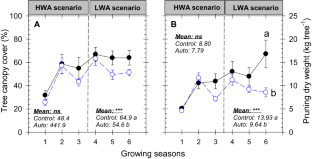 This work studies the feasibility of using automated drip irrigation based on the volumetric soil water content measured with capacitance probes in early maturing nectarine trees (Prunus persica L. Batsch, cv. ‘Flariba’) grown in a clay–loam soil in Mediterranean conditions. An automated irrigation treatment (AUTO), based on the management allowed depletion (MAD) concept (with a feed-back control system), was compared with an irrigation-scheduling method based on the conventional crop evapotranspiration (100% ETc) as Control, under high (HWA) and low (LWA) water availability scenarios, each during three consecutive growing seasons. With HWA (no water restriction), the AUTO treatment maintained the soil water content at near field capacity (α = 10% depletion of available soil water content), and there were no significant differences between treatments in terms of the plant–soil water status, nectarine yield, or fruit quality parameters. Under LWA conditions (water deficit), the AUTO treatment (α = 10% during pre-harvest and 30% post-harvest) provided 43% less water than the Control, promoting a moderate plant water deficit, which led to a decrease in vegetative growth (winter pruning and tree canopy cover) but no significant differences in total yield and fruit quality parameters (although the total soluble solid content increased). The water use efficiency values in the AUTO treatment increased by an average of 34%. It was concluded that automated irrigation, based on MAD seasonal threshold values and monitored by means of real-time soil water content sensors, could be considered a promising tool for application in semi-arid Mediterranean agro-systems subjected to water scarcity.