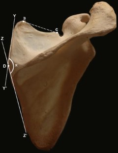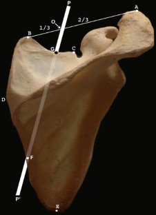 The study was conducted on 92 intact dry adult scapulae of unknown sex. The junction of the medial two-thirds and the lateral one-third of an imaginary line joining the superomedial angle and the lateral margin of the acromion was marked as superior Bell’s portal. The middle of the medial border was considered as the arthroscopic resection target. The site of resection on the upper border was found out with the help of these two points and other relevant measurements were also taken.