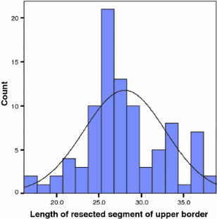 The distance between the suprascapular notch and the lateral edge of resection on the upper border of the scapula was more than 10 mm in 85.9% cases and less than 10 mm in 14.1%. A statistically significant positive correlation was found between this distance and the distance between the superior angle and acromion angle of the scapula.