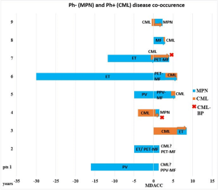 Cambier N, Renneville A, Cazaentre T, Soenen V, Cossement C, Giraudier S, Grardel N, Laï JL, Rose C, Preudhomme C (2008) JAK2V617F-positive polycythemia vera and Philadelphia chromosome-positive chronic myeloid leukemia: one patient with two distinct myeloproliferative disorders. Leukemia 22(7):1454–1455