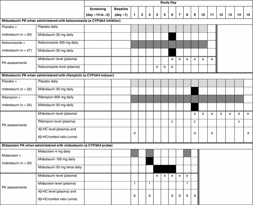 The concentrations of unchanged midostaurin, CGP52421, and CGP62221 in the plasma were determined using a validated liquid chromatography–tandem mass spectrometry (LC–MS/MS) assay with a lower limit of quantitation (LLOQ) of 10 ng/mL (Novartis SAS France bioanalytics and SGS, Cephac Europe, SAS). The concentration of ketoconazole in plasma was assessed using a validated LC–MS/MS assay with an LLOQ of 50.0 ng/mL (WuXi Pharmatech Co, Ltd, China). The concentration of rifampicin in plasma was measured using a validated LC–MS/MS assay with an LLOQ of 5.0 ng/mL (SGS, Cephac Europe, SAS). Plasma concentrations of midazolam and its metabolite 1′-hydroxymidazolam, which is generated by CYP3A4 and CYP3A5 in humans, were measured using a validated LC–MS/MS assay with an LLOQ of ≈0.100 ng/mL (SGS, Cephac Europe, SAS). The plasma concentration of 4β-hydroxycholesterol was measured using a validated LC–MS/MS assay with an LLOQ of 3.0 ng/mL (SGS, Cephac Europe, SAS). The concentrations of 6β-hydroxycortisol and cortisol in urine were determined using validated LC–MS/MS assays with an LLOQ of 10.0 ng/mL for 6β-hydroxycortisol and 1.0 ng/mL for cortisol. The ratio of 6β-hydroxycortisol to cortisol was subsequently calculated (SGS, Cephac Europe, SAS). See Supplementary Table 2 for detailed bioanalytical methods for all 3 studies.