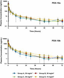 This was an open-label, nonrandomized, phase 1 study. Eligible patients received pralatrexate administered as an IV push over 3–5 min once weekly for 6 weeks in 7-week cycles until progressive disease or intolerable toxicity. Four cohorts of 6 patients were planned for a total of 24 patients. Patients with normal renal function (Cohort A), mild (Cohort B), and moderate renal impairment (Cohort C) received 30 mg/m2 pralatrexate once weekly for 6 weeks in 7-week cycles, and patients with severe renal impairment (Cohort D) were to be administered 20 mg/m2 once weekly for 6 weeks. Plasma and urine samples were collected at pre-specified time points to determine the PK profile of pralatrexate in each treatment cohort. Patients were followed for safety and tolerability.