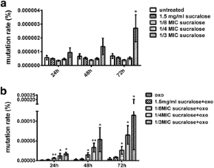 Because of heavy use of antimicrobials, antimicrobial resistance in bacteria has become of great concern. The effect of some widely used food additives such as sucralose on bacteria in the gut and the environment has also drawn increasing attention. In this study, we investigated the interaction between antimicrobials and sucralose impacting antimicrobial resistance and mutation of Escherichia coli (E. coli). To examine antimicrobial resistance and mutation frequency, different subinhibitory concentrations of sucralose were added to cultures of E.coli BW25113 that were then treated with antimicrobials, oxolinic acid, or moxifloxacin. Then the E.coli were assayed for bacterial survival and recovery of mutants resistant to an unrelated antimicrobial, rifampicin. Pre-treatment of E.coli BW25113 with 1/2 minimal inhibitory concentration (MIC) of sucralose increased the survival rate in oxolinic acid or moxifloxacin. A 1/3 MIC of sucralose increased rifampicin-resistant mutation rate of E.coli BW25113 after 72 h, while rifampicin-resistant mutation rate was increased when co-treated with 1/8 MIC, 1/4 MIC, 1/3 MIC sucralose, and oxolinic acid after 24 h. Sucralose can increase the antimicrobial resistance and mutation frequency of E.coli to some antimicrobials.