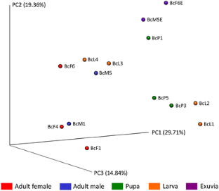 Bactrocera carambolae is a highly polyphagous fruit pest of agricultural importance. This study reports the bacterial communities associated with the developmental stages of B. carambolae. The microbiota of the developmental stages were investigated by targeted 16S rRNA gene (V3–V4 region) sequencing using the Illumina MiSeq. At 97% similarity, there were 19 bacterial phyla and unassigned bacteria, comprising 39 classes, 86 orders, 159 families and 311 genera. The bacterial composition varied among the specimens of developmental stage and across developmental stages as well as exuviae. Four phyla of bacteria (with relative abundance of ≥1% in at least one specimen)—Actinobacteria, Bacteroidetes, Firmicutes and Proteobacteria—were recovered from the larva, pupa, adult stages and exuviae. Proteobacteria was the predominant phylum in all the developmental stages as well as the exuviae. Enterobacteriaceae (Proteobacteria) was the predominant family in the adult flies while the family [Weeksellaceae] (Bacteroidetes) was predominant in the larval and pupal stages. Among the genera occurring in more than one developmental stage of B. carambolae, Erwinia was more abundant in the larval stage, Halomonas more abundant in adult female, Stenotrophomonas more abundant in adult male, and Chryseobacterium more abundant in the larval and pupal stages. The results indicate transmission of bacteria OTUs from immatures to the newly emerged adults, and from exuviae to the environment.