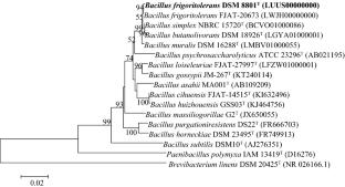 16S rRNA gene sequence analysis showed that the type strain Brevibacterium frigoritolerans DSM 8801T had the highest similarity (99.7%) with the reference strain Bacillus simplex NBRC 15720T, followed by Bacillus muralis DSM 16288T (99.6%), Bacillus butanolivorans DSM 18926T (99.5%), and Bacillus loiseleuriae FJAT-27997T (97.9%). This relationship is confirmed by the phylogenetic analysis indicating that Bre. frigoritolerans DSM 8801T fell in the genus Bacillus group and formed a clade with the closely related Bacillus species. Average nucleotide identity and in silico DNA–DNA hybridization (isDDH) values between strain DSM 8801T and the most closed reference strain Bac. simplex NBRC 15720T were both much lower than species definition threshold values of 95% and 70%, respectively, which indicated strain DSM 8801T should not be affiliated to one of the validly named Bacillus species. The percentage of conserved protein (POCP) values between the strain DSM 8801T and the type strains of the above species were 80.7%, 69.2%, 72.2%, 53.6%, and 50.0%, respectively, higher than the genus definition threshold value of 50%. The main isoprenoid quinone of strain DSM 8801T was MK-7, the main polar lipids were diphosphatidylglycerol (DPG), phosphatidylglycerol (PG), and phosphatidyl ethanolamine (PE), and the major fatty acids were anteiso-C15:0 and iso-C15:0. On the basis of the phenotypic, chemotaxonomic, phylogenetic and genomic characteristics, Bre. frigoritolerans DSM 8801T should belong to the genus Bacillus, and be proposed to reclassify as Bacillus frigoritolerans comb. nov., with the type strain DSM 8801T (=ATCC 25097T = CCUG 43489T = CIP 67.20T = JCM 11681T).