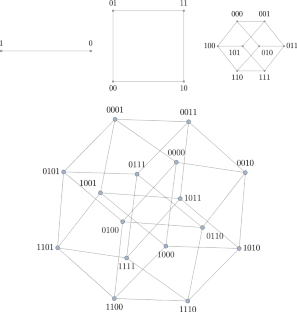 Let \(X=\{0,1\}^2\) be the binary square with points \(x_0=[0,0]\), \(x_1=[0,1]\), \(x_2=[1,0]\), \(x_3=[1,1]\) (binary representation of indices) with the Hamming metric d. Let \(\Gamma \cong D_4\) (the dihedral group of order 8) be the group of all isometries of X. Then the triple \((X,d,\Gamma )\) is symmetric.